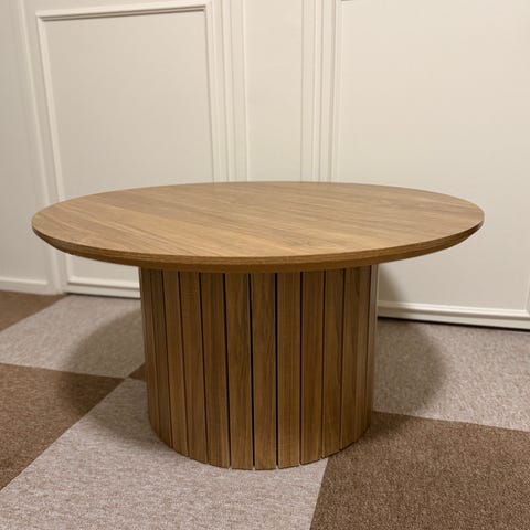 Pyöreä sohvapöytä, jossa harmaa pöytälevy ja metallirunko. Pöydässä on neljä kapeaa jalkaa ja tukiristikko jalkojen välissä. Sopii esimerkiksi olohuoneeseen sohvapöydäksi tai sivupöydäksi. Koko ja tarkat mitat eivät käy ilmi kuvista.