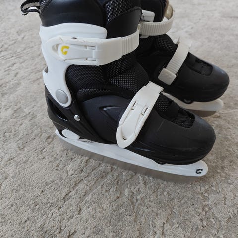 Graf-merkkiset lasten luistimet, joissa koko on säädettävissä 34-37 koon välillä. Väri mustavalkoinen. Solkikiristys. Kärjissä naarmuja, mutta muuten oikein toimivat luistimet seuraavalle harjoitteluun.