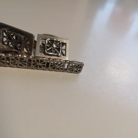 Martti Viikinniemen suunnittelemat hopeiset solmioneula ja kalvosinnapit.