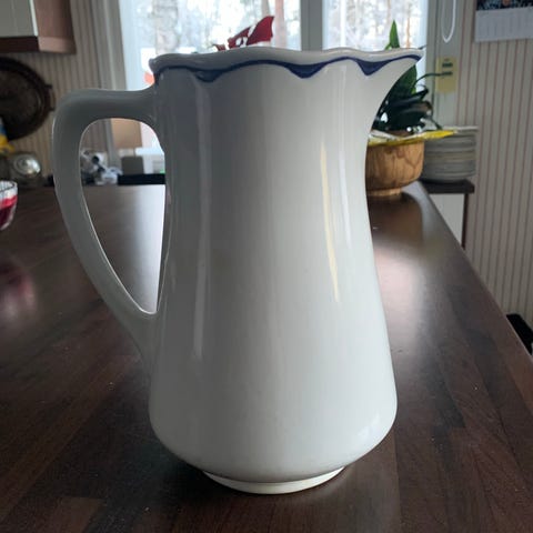 Arabia Pekka kannu. Valkoinen posliinikannu, jossa sininen koristekuvio yläreunan alla. Pohjassa Arabia -leima ja numeromerkintä.