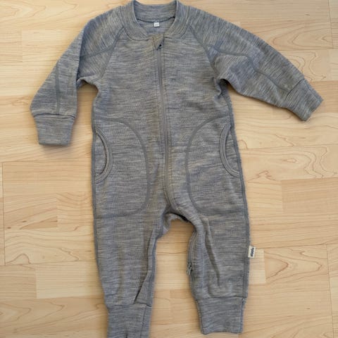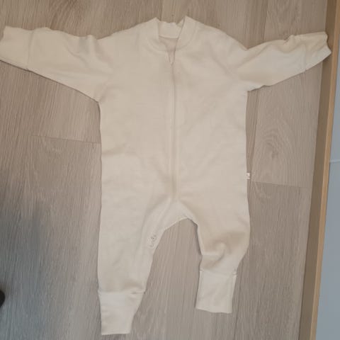 Pippi-merkin merinovilla haalari, koko 68-74, luonnonvalkoinen. Käytännöllinen kaksisuuntainen vetoketju, käännettävät hihan- ja lahkeensuut.