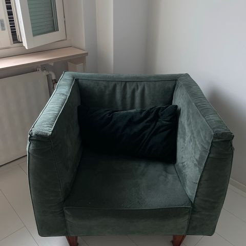 Nojatuoli, jossa kukkakuvioinen kangasverhoilu vaalealla pohjalla. Tuolissa on pehmustetut käsinojat ja korkea selkänoja. Mukana on saman kuosin koristetyyny. Sopii olohuoneeseen tai luku- ja oleskelunurkkaukseen istuimeksi yhdelle henkilölle.