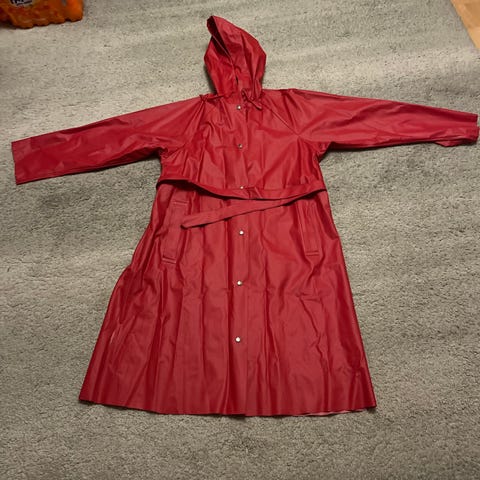 Rukka sadeasu, sadeviitta, musta, koko XS, 32-34, kaulus-helma 105 cm, aukot neppareilla, etuosa neppareilla, huppu nyörillä, kunto K3, käytön jälkiä.