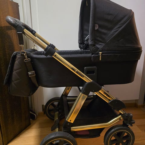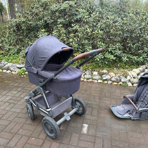 Kahdella lapsella ollut käytössä. Ratas osa kuluneempi, kuvattu. Iso tavarakori. Saa helposti kasaan. On ollut adapterilla myös kaukalo ratasosassa.