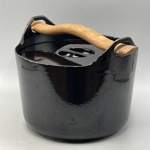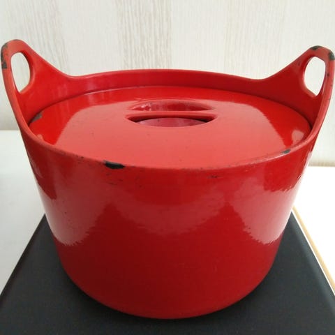 Erikoisuutena pienempi koko, 2 litraa. Valurauta, emali, kahva tiikkiä. Kokonaiskorkeus 16 cm. Halkaisija 21 cm.