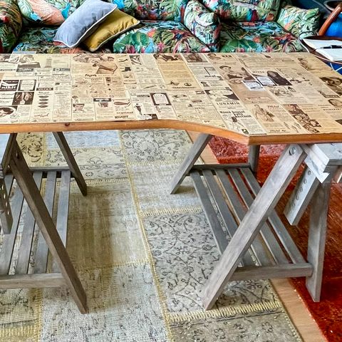Pöytä, jossa puinen pöytätaso ja valkoinen runko. Neliönmuotoinen malli, neljä suoraa jalkaa. Sopii esimerkiksi keittiöön, ruokailutilaan tai pieneen työpisteeseen. Pöytätaso on luonnonsävyistä puuta, jossa näkyy puunsyykuviointi.