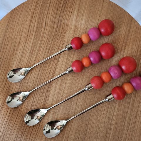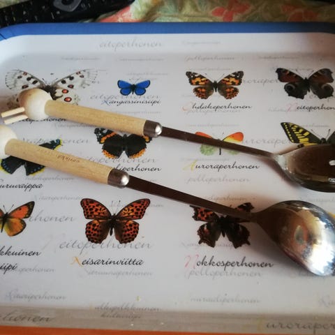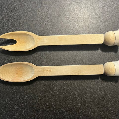 Aarikka Puisto salaattiottimet. Setissä on kaksi otinta, joissa on metallinen lusikkaosa ja vaaleista puuhelmistä koostuva varsi. Sopivat esimerkiksi salaattien, jälkiruokien tai muiden ruokien tarjoiluun. Designille tyypillistä on pelkistetty muoto ja puuosien helmirakenne.