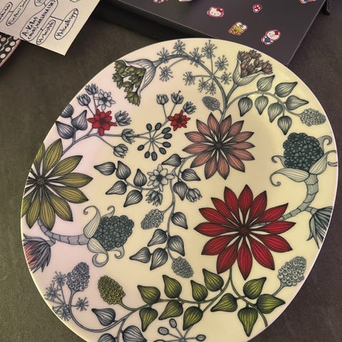 Arabia Runo kaadin. Valkoinen posliinikaadin, jossa monivärinen kukka- ja perhoskuviointi. Vetoisuus n litra Pohjassa valmistajan leima ja sarjan merkintä.