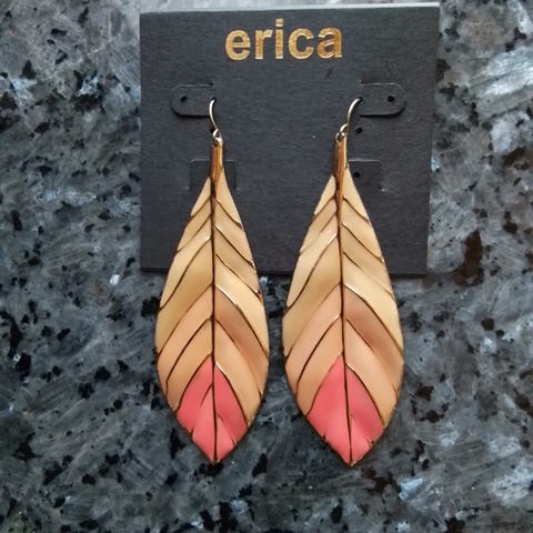 Turkoosinsiniset sulkakorvakorut. Koukkukiinnitteiset korvakorut, joissa metallinen pyöreä koristeosa ja riippuvia höyhenriipuksia sinisen sävyissä sekä pienet metalliset sulkakoristeet. Materiaalina korumetalli ja tekohöyhenet tai muu keinomateriaali. Kokonaispituus n. 11 cm