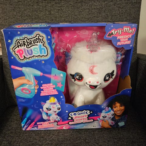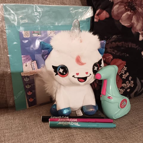 Koristele pehmohahmo mukana tulevilla Airbrush tusseilla. Pehmon voi pestä ja koristella uudestaan. Sisältää pehmon, Airbrush laitteen, 4 tussia ja sabluunoita.