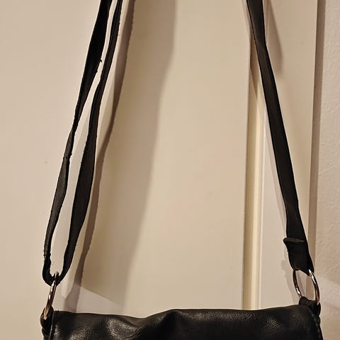 Nahkainen, tilava olkalaukku jossa paljon vetoketjutaskuja. Korkeus n.25cm ja leveys 30cm. Vähän käytetty ja ehjä laukku-pinta ei ehkä tykännyt kun pesin laukun. Hp:15€