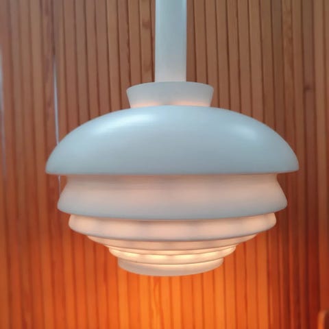 Artek A810 lattiavalaisin, valmistaja Valaistustyö, suunnittelija Alvar Aalto. Valaisimessa on messinkinen jalka, mustalla nahalla, sekä valkoiset varjostimet. Valaisimessa on iän mukaista kulumaa.