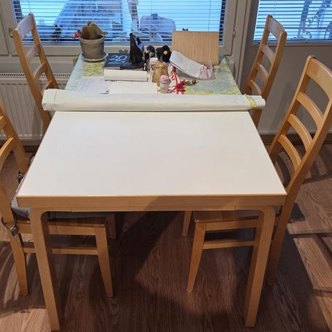 Pöytä ovh 519€ , Asko ruokatuolit Lucy ovh 219€ /kpl