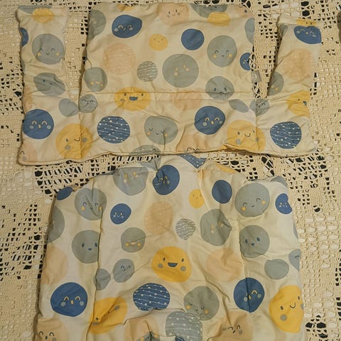 Stokken Tripp Trapp tuolin värikkäät pehmusteet. Toisesta istuinosasta on revennyt yksi sauma, sen saa kyllä helposti korjattua eikä vaikuta juurikaan käyttöön.