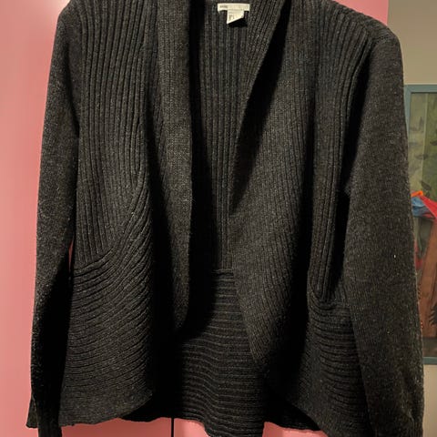 H&M neuletakki naisille, koko L. Väri musta. Materiaali akryyliä. Malli on avonainen, ilman napitusta tai vetoketjua. Neulos on selässä ja helmassa selkeästi ribattu, hihat sileämpää neulosta. Sopii käytettäväksi esimerkiksi arjessa kerrospukeutumiseen paidan tai topin päällä.