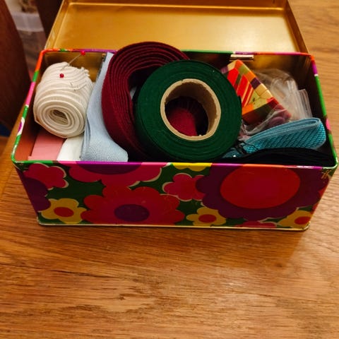Sekalainen askartelu- ja ompelutarvikepaketti. Kokoelma sisältää erilaisia nauhoja, pitsiä, nappeja, helmiä, koristekiviä, lankaa, ja muita pientarvikkeita käsitöihin. Sopii esimerkiksi ompeluun, korujen ja hiuskoristeiden tekemiseen, korttiaskarteluun sekä muihin käsityö- ja askarteluprojekteihin. Useita eri värejä ja materiaaleja, tarkka sisältö vaihtelee kuvien mukaisesti.
