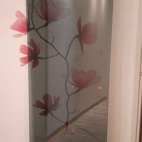 Uusi 8mm karkaistu,kirkas ovilasi,koko 690mm x 2016mm,kromisaranat joissa pienet jäljet varastoinnista kun pakkausta ei ole ollut.. ja kromi nuppivedin.
