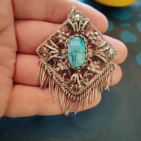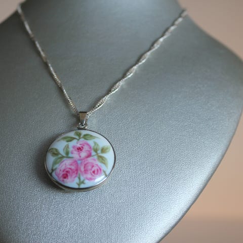 Hopean värinen kukka filigraaniriipus. Riipuksen leveys 3.5 cm, ketjun pituus 50 cm. Ei leimoja.