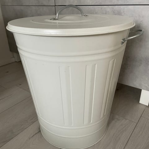 IKEA Knodd roskis/tynnyri. Valkoinen metallinen iso tynnyri , jossa irrotettava kansi ja sivuilla kantokahvat. Soveltuu esimerkiksi kodin jäteastiana, säilytysastiana tai pyykkikorina sisäkäyttöön