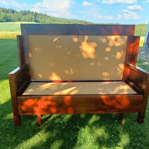 Puusohva on isoisäni tekemä n 1950-luvulla. Ollut meillä käytössä vuosikymmenten ajan. Perinteisellä puusepän ammattitaidolla tehtynä siirtynyt meillä sukupolvelta toiselle. Nyt joudutaan muuton ja tilanpuutteen takia myymään. Toivomme pääsee hyvää kotiin ja vielä pitkäaikaiseen käyttöön.