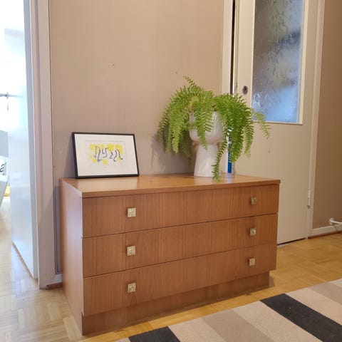 Myyntiin kauniisti patinoitunut teak-lipasto messinkisillä vetimillä. Hyvässä kunnossa, eikä pieniä naarmuja ja lakan kulumakohtia lukuunottamatta moitetta kunnossa. Hiomalla ja uudelleenlakkaamalla saa halutessa entisöityä. Laatikoissa hyvin tilaa. Avainta ei tallessa, mutta laatikot on auki.