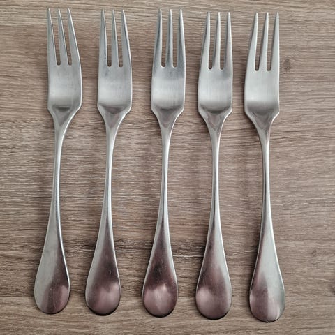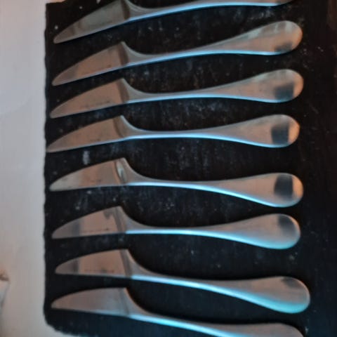 Iittala Mango sarjan veitset. Muutamassa veitsessä tumma piste, muuten hyvässä kunnossa. Nanny Still suunnittelema aterinsarja jota ei enää valmisteta.
