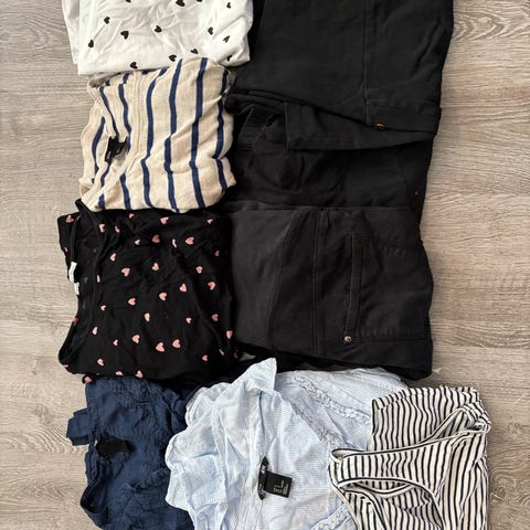 Myydään pieni kesäinen äitiysvaatepaketti. Shortsit on kokoa M, vaaleanpunaiset housut kokoa 40 ja tummat housut kokoa 38.