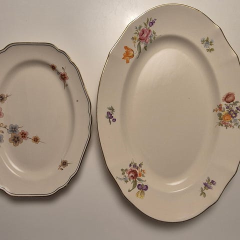 Arabia julia tarjoiluvadit. Valkoiset keraamiset vadit, joissa keltainen ja vihreä kukkakuvio. Sopivat esimerkiksi ruoan tai leivonnaisten tarjoiluun. Kuvissa näkyy vadin muoto ja koristekuvio sekä pohjassa oleva Arabia-leima.