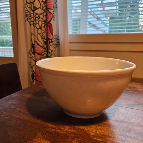 Arabia pilkkumi, taikinakulho 3 litraa. Vähäisiä käytönjälkiä sisäpohjassa. Ei paloja pois, ei krakeloitumaa. Kaikki kuvissa näkyvät jäljet ovat valmistuksessa tulleita, niissä on lasite päällä. Halkaisija 23cm, korkeus 12,5cm ja paino 1367g. Ei Toridiiliä. Nouto tai Matkahuollon lähetys.