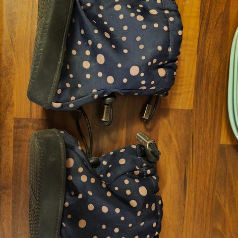 Stonz tossut. Unisex-malli, m koko, sininen päällinen ja mustat vahvistetut pohjat. Ohut vuori. Kiristettävät nauhat = tossut pysyy hyvin jalassa. Sopii käytettäväksi esimerkiksi vaunulenkeillä tai autoillessa. Kuivalla säällä ryömiessäkin. Kulumaa jo vähän on, joka näkyy kuvissa, mutta ei ainakaan meillä haitannut nuorimmaisella käyttöä, ellei aio lätäkössä leikkiä. 😄 Eivät ole läpiasti rikki.