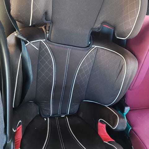 Muutettava pituus. Musta on hieman isompi, ja se myös hieman levenee, kun niskatukea nostetaan ylöspäin. Käytetään auton oman turvavyön kanssa. Painorajasta ei tietoa, mutta menevät isommallekin lapselle.