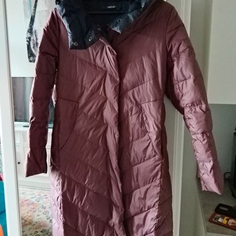 Lämmin untuvatakki, naisellinen malli. Muhkea huppu/kaulus, vyö, taskut. Kaunis, tumma violetti väri. Koko 34 (reiluhko) Kissatalous. Juuri pesty.