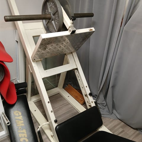 Kuntosalilta aikoinaan ostettu todella hyväkuntoinen Powersteelin jämerä smith kone. Maks.paino 200kg. Mitat k225 l220 s100. 50mm tanko.