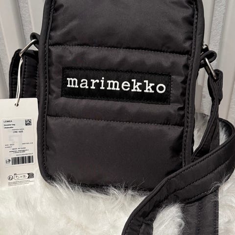 Itselle vähälle käytölle jäänyt Marimekon musta Leimea-olkalaukku.