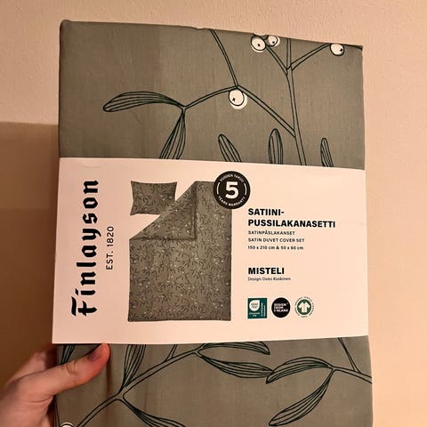 Finlayson -merkkinen sininen satiinipussilakanasetti, johon kuuluu 1 normaalikokoinen yhden hlön pussilakana ja 1 tyynyliina. Hyvin vähän käytetty. Pesty.