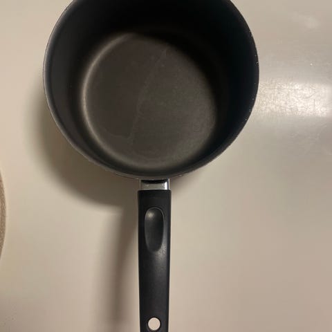 Metal frying pan with a riveted metal handle. The inside of the pan shows signs of wear and patina. Suitable for frying food on the stove. The outer bottom is flat.
