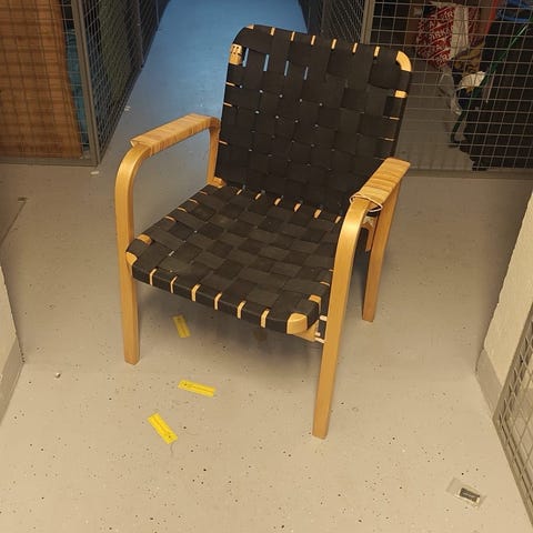 Artek nojatuoli 45, suunnittelija Alvar Aalto. Runko taivutettua koivua, istuin ja selkänoja valkoista keinonahkaa. Nojatuolissa on käsinojat joissa kierrepunosta ja se soveltuu istuimeksi esimerkiksi olohuoneeseen, lukunurkkaukseen tai työtilaan. Klassinen, pelkistetty muotoilu ja kevyt ilme tekevät tuolista helposti yhdistettävän erilaisten sisustusten kanssa. Siistikuntoinen, vähäisiä käytön jälkiä eli iänmukaista käyttökulumaa.