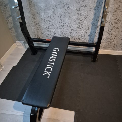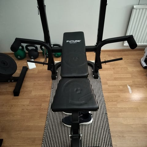 Säädettävä kuntosalilta ostettu jämäkkä reenipenkki. Mitat: k46 l30 p125.