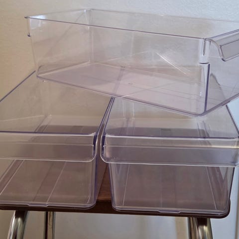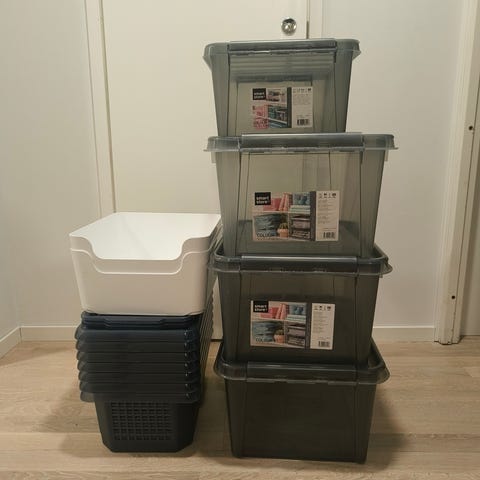 3 kpl Ikean, harmaita kangaspäällysteisiä laatikoita. Laatikoissa on säilytetty cd ja dvd levyjä, mutta käyvät toki monenlaiseen säilytykseen tukevuutensa puolesta.