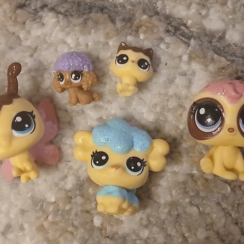 Kasa erilaisia Lps hahmoja, osassa glitteriä. Kaikki kerralla.