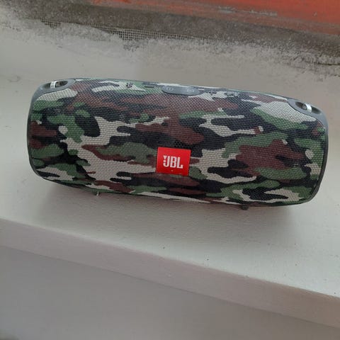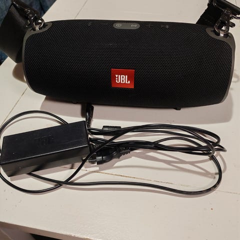 JBL Xtreme Bluetooth-kaiutin punaisella kangaspinnalla. Kannettava malli, jossa olkahihna helpottaa kuljettamista. Laturi ei ole alkuperäinen mutta toimii.