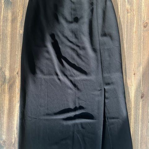 Hansmark naisten hame, koko XL (lapussa koko 40). Suora, polvipituinen malli. Hame on musta ja siinä on leveä vyötärökaitale, joka näyttää keinonahkaiselta. Takana on halkio liikkumisen helpottamiseksi sekä vetoketju- ja nappikiinnitys. Sopii arki- ja toimistokäyttöön.