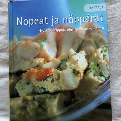 Myyn Maittavat-sarjan Salaatit: Hyviä ja helppoja ohjeita vaihe vaiheelta -nimisen reseptikirjan. Etupuolelta nypätty tyhjä sivu pois, koska siinä oli omituskirjoitus. Muutama aukeama on saanut hiukan kosteutta (kokatessa, eli ei ole säilytetty kosteissa tiloissa, ks. kuvat). Silmäilin enkä huomannut muita moitteita, mutta joissain resepteissä saattaa olla merkintöjä. Kokonaisuudessaan kirja on kuitenkin varsin siisti, ehjä ja hyväkuntoinen.