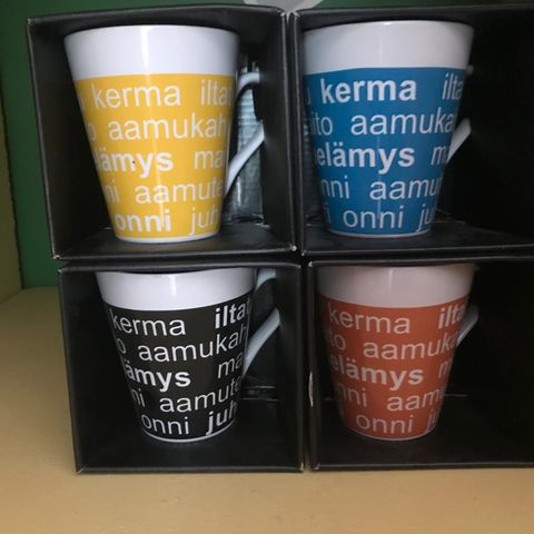 Korvattomat mukit teksteillä. Kunto kuin uusi, siististi pidetyt ja vähän käytetyt.