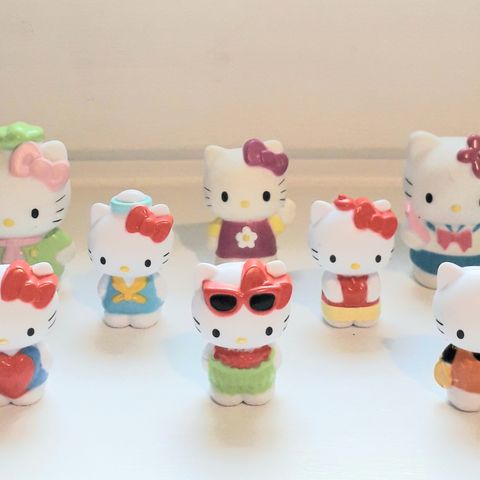 Hello Kitty -aiheinen setti, johon kuuluu useita avaimenperiä. Figuureista on kiinnityslenkki tai klipsi, joten niitä voi käyttää esimerkiksi avaimenperinä, reppukoruina tai koristeina.