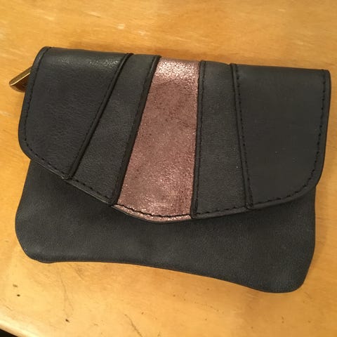 Kotimainen Elmerelli kukkaro kangasta, leveys noin 18cm, korkeus noin 12cm. Napakka suljinmekanismi, sisällä paikat neljälle kortille. Hyvä käytetty kunto.