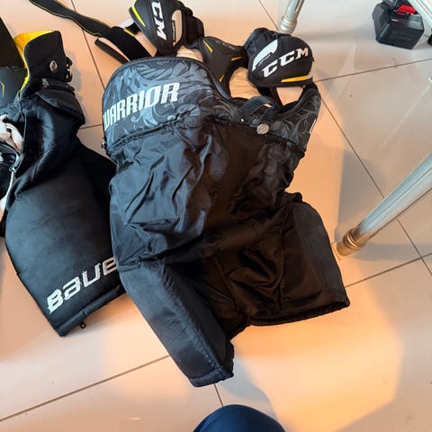 Warrior junior jääkiekkotakki, koko 128. Musta takki, jossa valkoiset tereet ja Warrior-logot edessä ja takana. Soveltuu jääkiekkoharjoituksiin ja -pelimatkoille lämmittely takiksi.