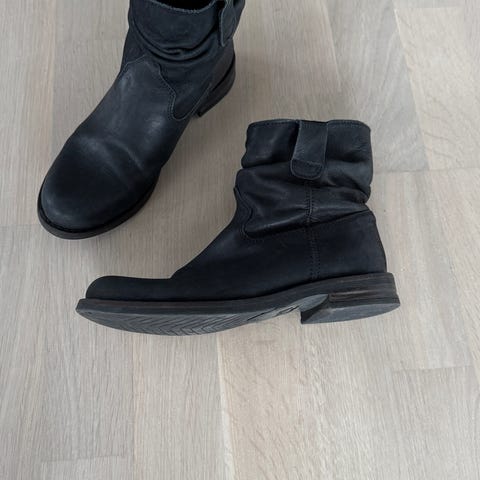 Buffalo London nahkaiset mustat nilkkurit, koko 39. Nilkkureissa on matala varsi ja korko, sivulla kullansävyinen solki. Vetoketju.
