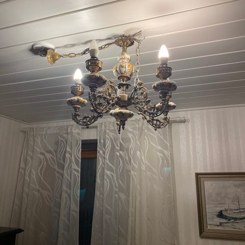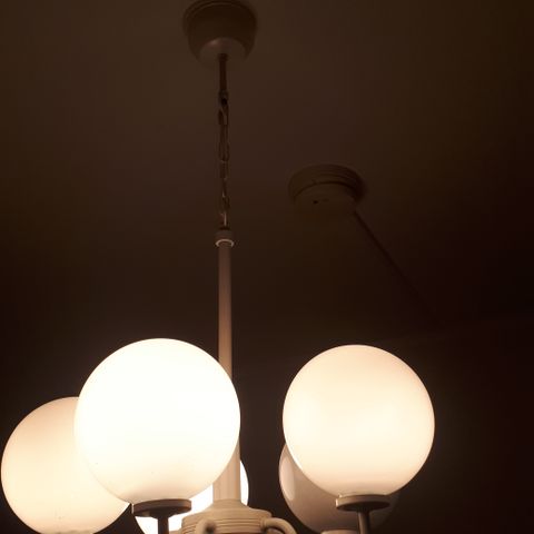 Myydään kaunis messinginvärinen kattovalaisin, jossa neljä opaalilasista palloa