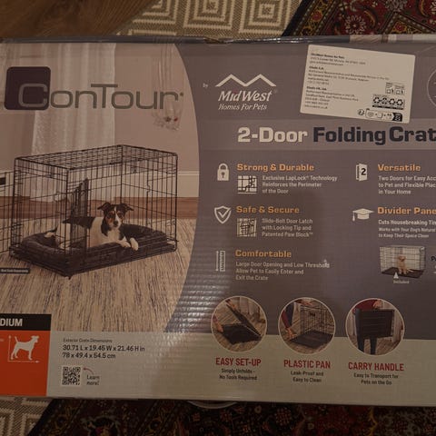 Kangashäkki koiralle. Sininen ja musta, kokoontaitettava malli, jossa useita verkkopaneeleja ilmanvaihtoa ja näkyvyyttä varten. Vetoketjulliset aukot sivussa ja päällä helpottavat lemmikin sisäänpääsyä. Pohjalla irrotettava alusta. Soveltuu sisäkäyttöön lemmikin omaksi lepopaikaksi tai tilapäiseen majoitukseen sekä mahdollisesti myös kuljetukseen esimerkiksi autossa, kun häkki on kiinnitetty asianmukaisesti. Häkki on ollut vähäisellä käytöllä, erittäin siisti vielä seuraavalle käyttäjälle.